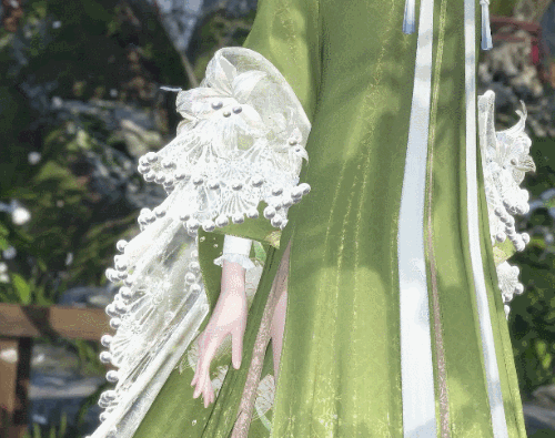 先拿女款来说,时装选用了汉服制式的绿色长衫和马面裙,然后搭配上百合花、珍珠等材料装点的现代风格配饰,例如簪花小洋帽,梦幻唯美的蕾丝披肩,一下就把春日少女的明媚感衬托出来了,也难怪很多女玩家第一眼看到就走不动道了。